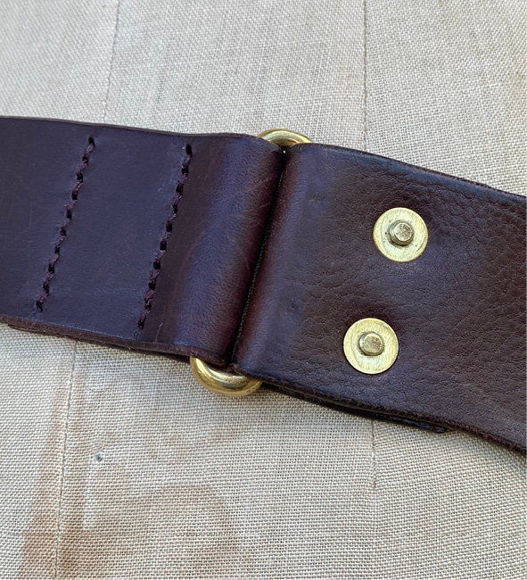 Vegetable-tanned leather with buckle, dee-ring, loops and rivets in solid brass.