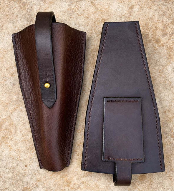 The strong yet soft tumbled leather on the front of these secateur holster will gently shape to fit standard-sized secateurs, holding them snug. A little strap secured by a Sam Brown stud keeps them completely secure. The back of the holster is made from thick oak bark tanned bridle leather. Designed to attach to a belt up to 4.5cm in width.