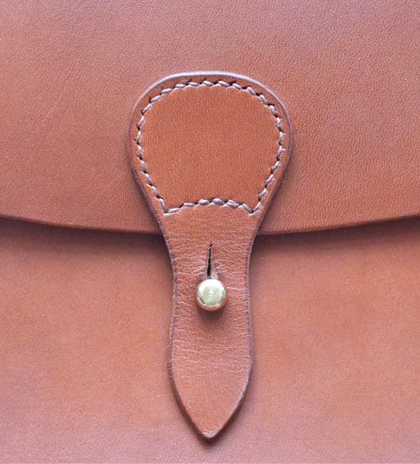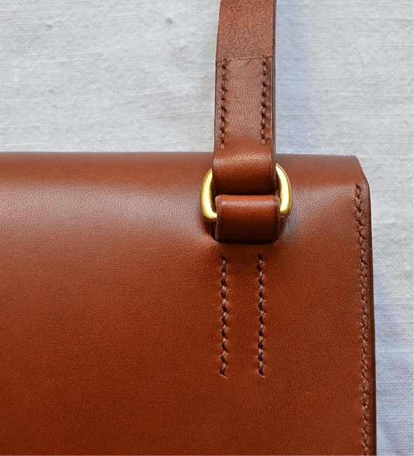 vegetable-tanned leather with solid brass dee-rings holding the shoulder strap and Sam Browne closure. Hand stitched with French linen thread coated in beeswax.